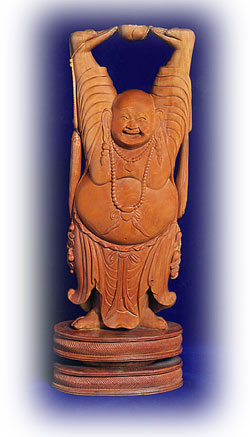 A carving of a smiling Buddha doing QiGong.